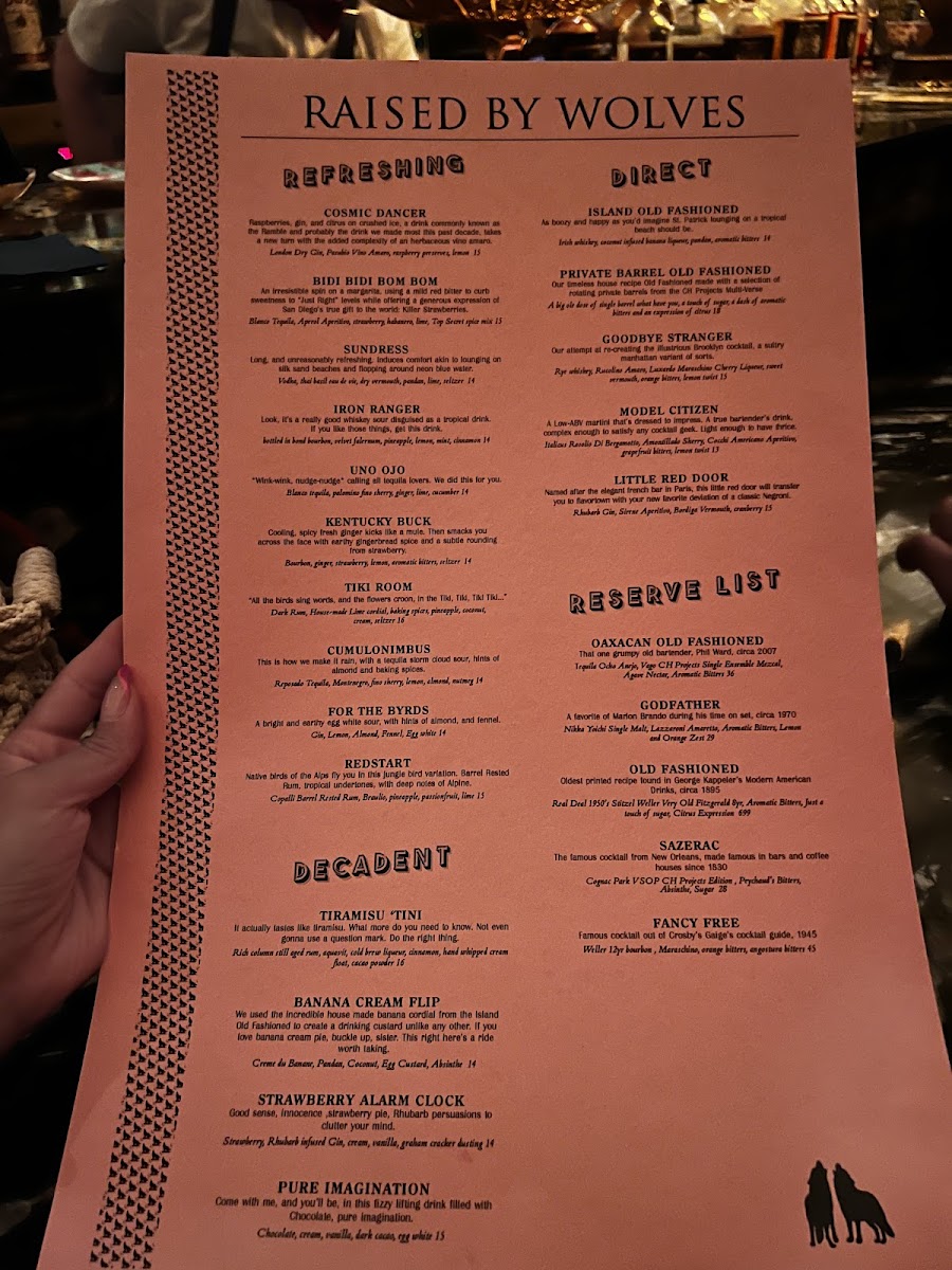The ambiance is captivating, reminiscent of a bygone era, perfect for enjoying these exquisite concoctions. With glowing customer reviews highlighting its exceptional service and drink quality, "Raised by Wolves" is a must-visit for cocktail enthusiasts ready to embark on an unforgettable evening.